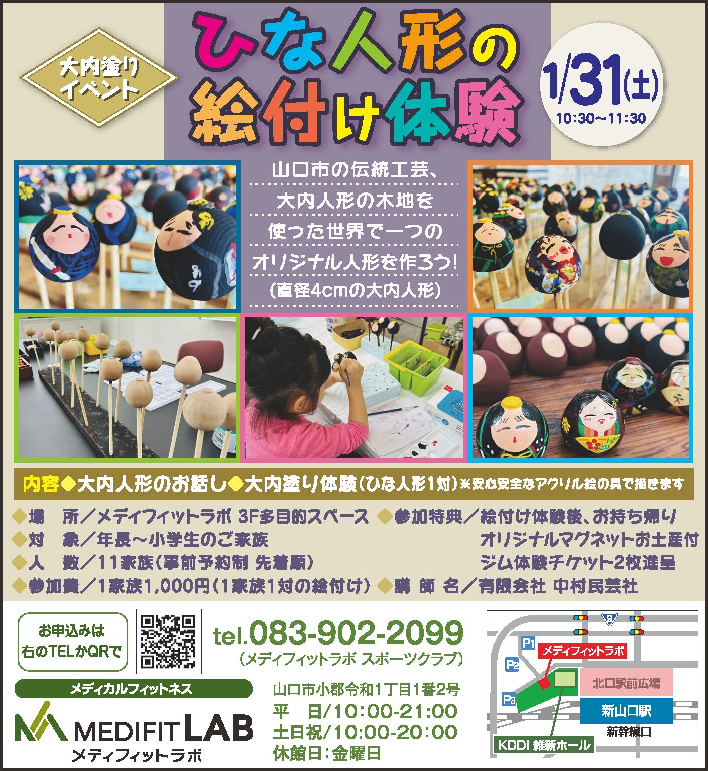 メディフィットラボでは、山口市の伝統工芸「大内人形」を使った「ひな人形の絵付け体験イベント」を開催します。