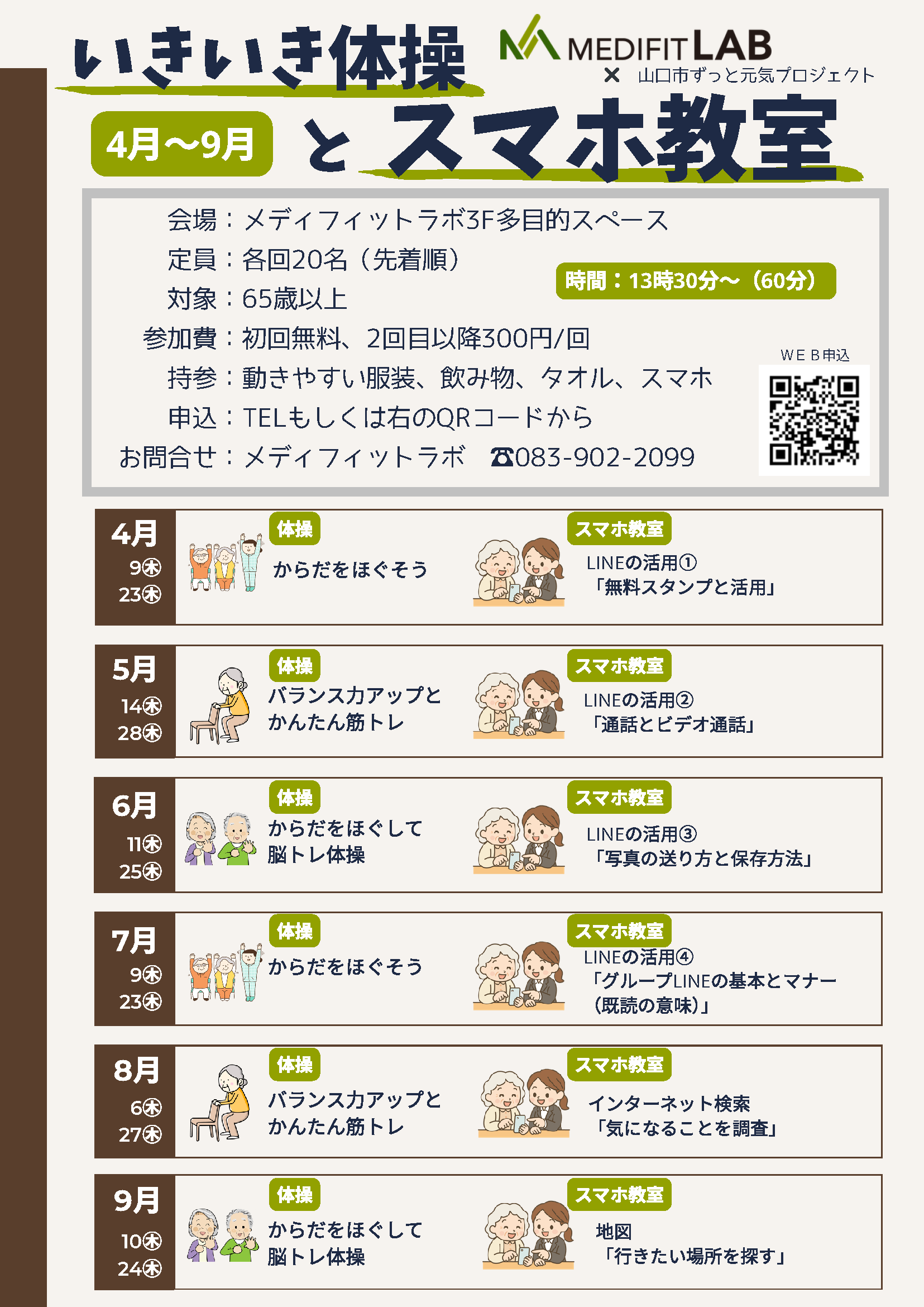 前半はメディフィットラボのトレーナーによる、無理なく継続できる運動プログラムを行い、後半には日常に役立つスマートフォンの使い方を学ぶ教室を予定しています。