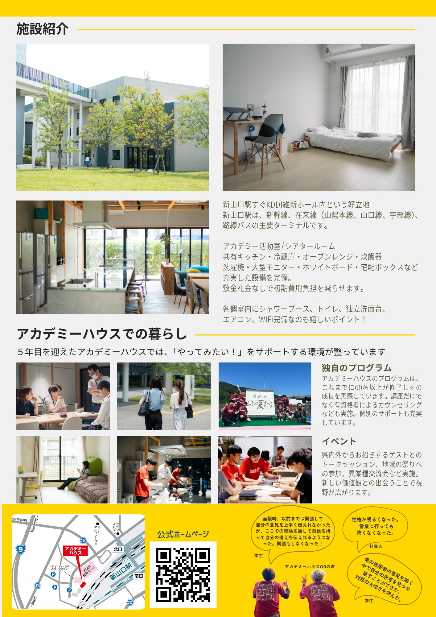 アカデミーハウスは、学生や若手社会人を対象とした居住型の人材育成施設です。山口地域を牽引する次世代リーダーとなる自律した人材の育成を目指すとともに、地元の企業や起業家、大学や高校等、地域、行政との交流やコミュニティづくりを通じて、若い人材の地域定着を図ることを目的としています。本施設では、入居者同士が共同生活を送りながら、アカデミーハウスの趣旨に賛同し、共同生活やコミュニティ活動に積極的に参加し、さまざまなグループ活動に取り組んでいただける方を募集します。